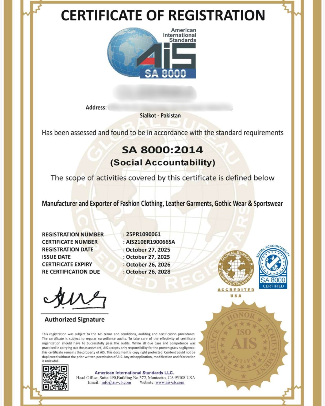 We are happy to report that our manufacturer is SA8000 Certified as well as ISO Certified. For privacy reasons, we have blurred out the name of our manufacturer, and have attached the SA8000 certification below:
